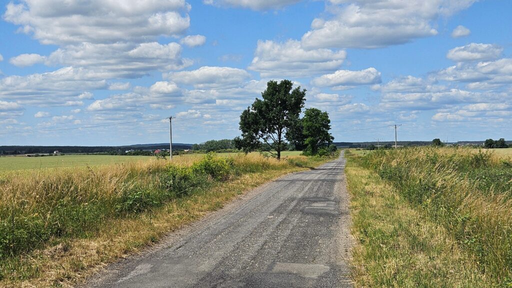 Docieramy do wiaduktu nad drogą ekspresową, u jego podnóża skręcamy w prawo. Jeżeli mieliście dość szutru, to teraz porównanie z drogą polną, którą przejedziemy przez kolejny kilometr.  Jedziemy wśród rozległych pól uprawnych, od czasu do czasu trafiają się śródpolne zakrzewienia.