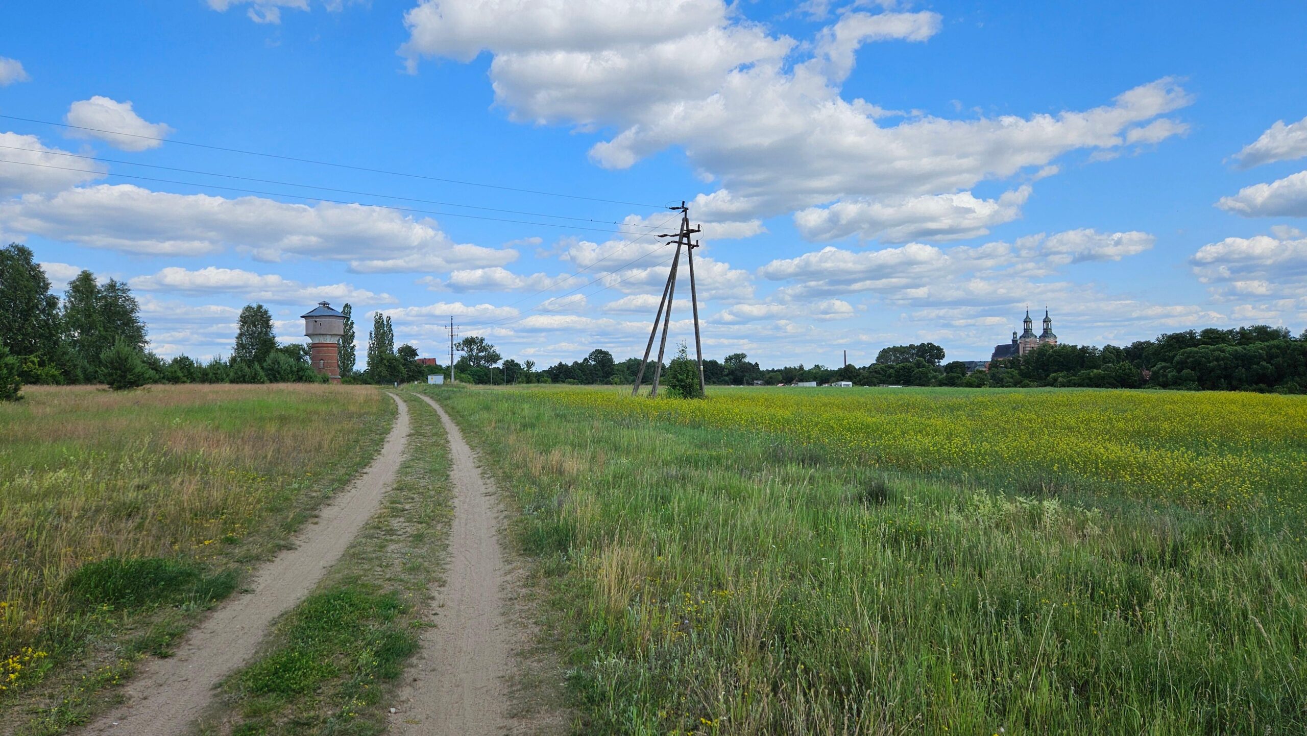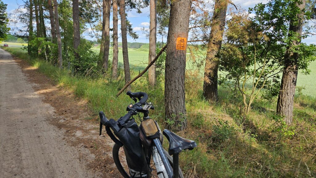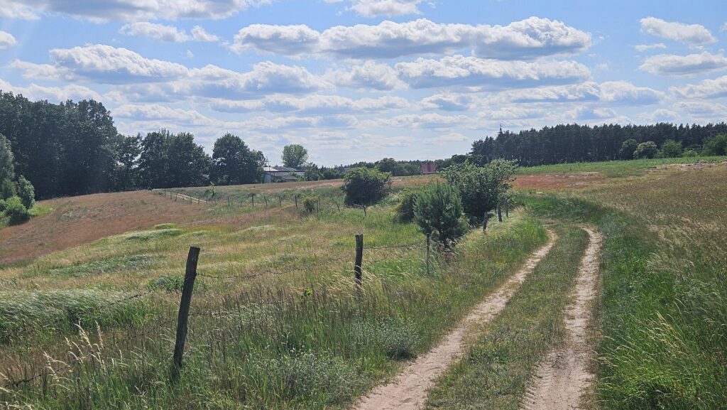 Pośród pól droga jest niezwykle piaszczysta, słabo przejezdna. Ale to dopiero początek – wjeżdżamy na łąkę z ledwie widoczną drogą. Można zwątpić, czy tędy na pewno przebiega szlak. Oj, stracicie na tym odcinku dużo czasu, gdyż gdy docieramy do nasypu nieczynnej linii kolejowej, droga jest tak zarośnięta, że trzeba prowadzić rower.