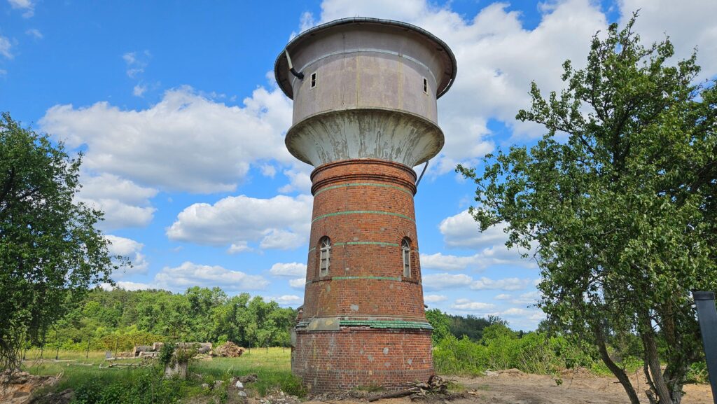 Gdy docieramy do wieży ciśnień, to wkraczamy już  na lepszą drogę. Kolejową wieżę ciśnień zbudowano w 1909 roku wraz z linią kolejową Międzyrzecz – Toporów.