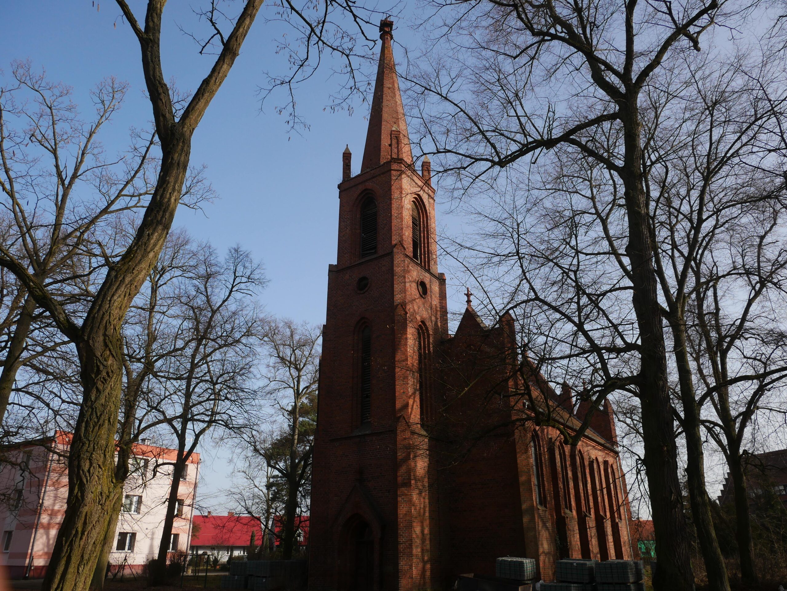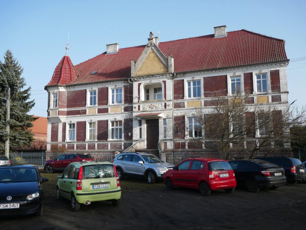 My skręcamy w prawo i wkraczamy do Gościkowa. Mijamy odnowiony budynek szkoły podstawowej. Warto podjechać prosto i przyjrzeć się bliżej seminarium duchownemu.  Przy szkole podstawowej skręcamy w lewo, przejeżdżamy obok ładnie zagospodarowanego skweru. Skręcamy w lewo, uwagę zwraca budynek z datą na fasadzie: 1908.