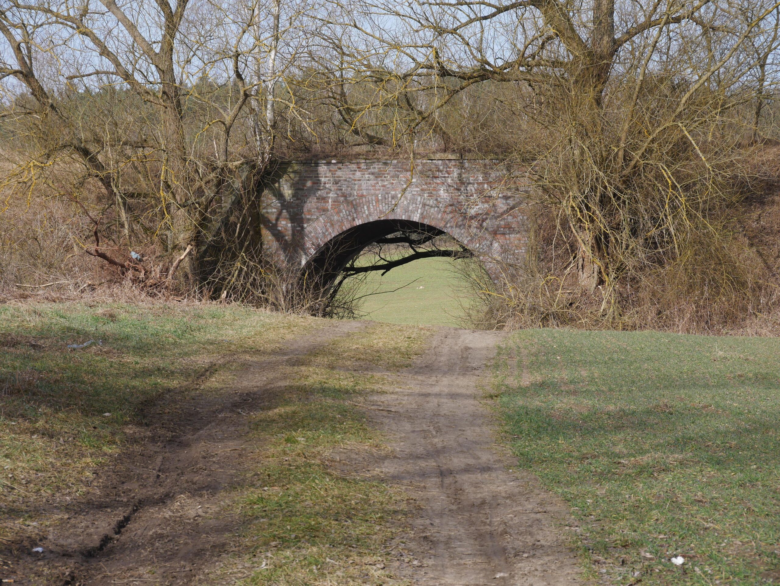 Już poza terenem wsi wkraczamy na drogę szutrową. Po lewej widzimy nasyp linii kolejowej, ciekawie wygląda tunel prowadzący na pola.